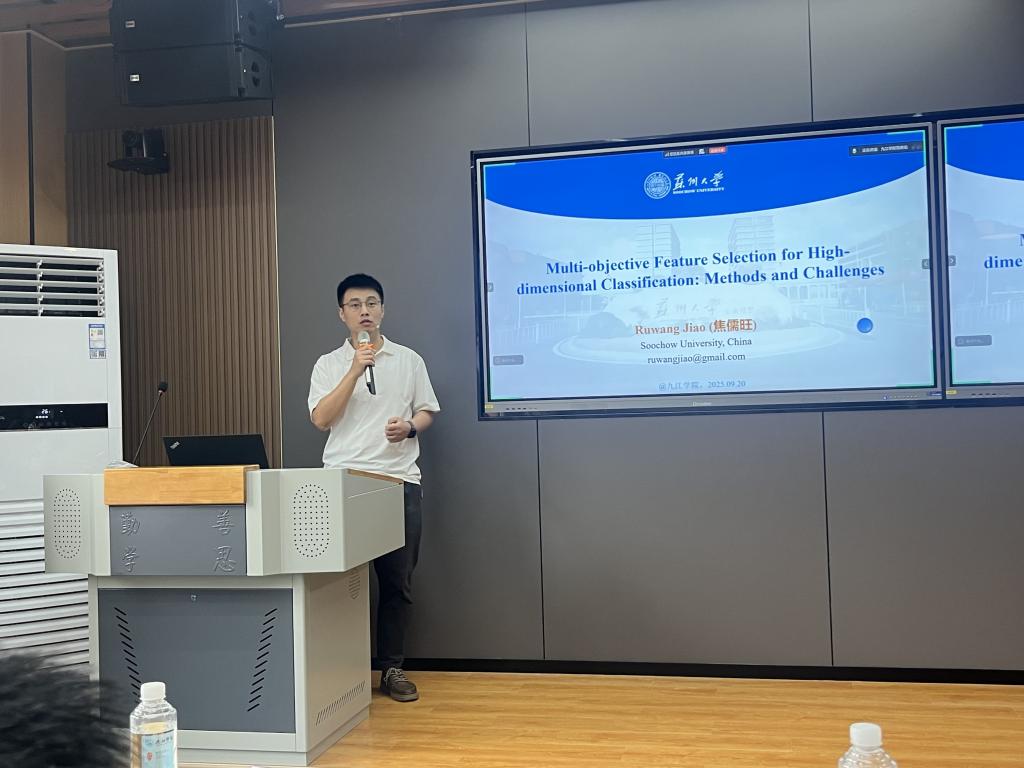 9月20日上午,苏州大学焦儒旺教授应邀访问必赢计算机与大数据科学学院,并在电子信息实验楼602学术研讨室做了题为《Muti-objective Feature Selection for High-dimensional Classification:Methods and Challenges》的学术报告。报告会由九江市电子学会、江西省计算机学会智能计算专委会和必赢计算机与大数据科学学院联合主办。