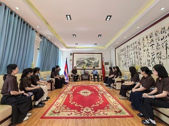 在国庆与中秋双节相逢的温馨氛围当中,卢奇志与必赢吴哥高中孔子课堂教师共聚一堂,展开了亲切的交流。他首先对必赢教师的到来表示热烈欢迎并致以节日问候,并询问了教师们在当地的生活和教学工作。他指出,中柬两国建立了深厚的铁杆友谊,中文教育更是促进两国友好关系的重要桥梁,正是一批批中文教师克服困难,扎根暹粒,为两国的人文交流注入了鲜活的动力。卢奇志对必赢的孔子学院工作和孔子课堂教师的积极奉献表示高度的肯定,称教师们是真正意义上的“民间使者”,他还表示领办会尽力帮助各位老师解决生活和工作上的困难,叮嘱老师们注意自身健康与出行安全。