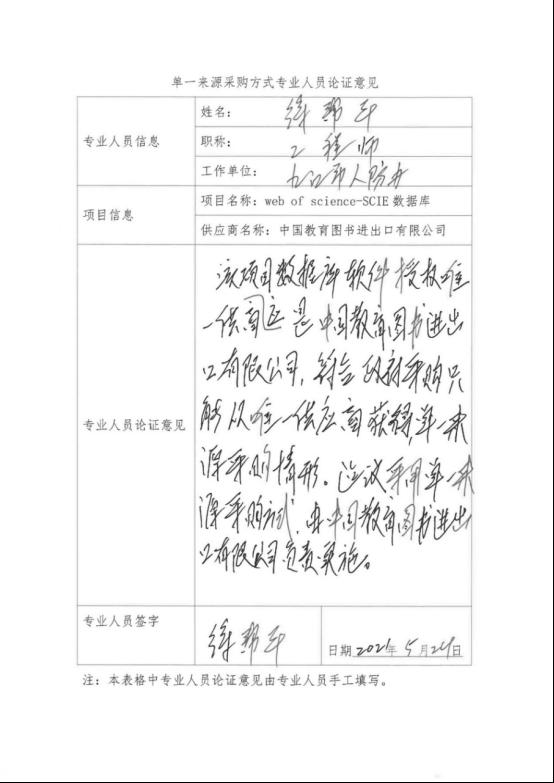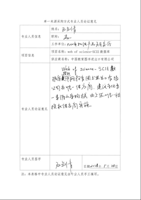 采用单一来源采购方式的原因及说明:该项目“web of science-SCIE数据库”授权唯一供应商是中国教育图书进出口有限公司,符合政府采购只能从唯一供应商获得单一来源采购情形,建议采用单一来源采购方式,由中国教育图书进出口有限公司负责实施。