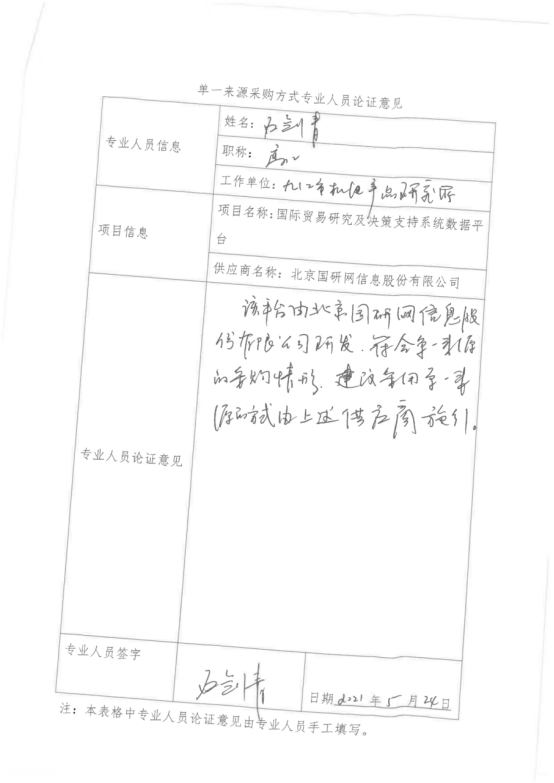 采用单一来源采购方式的原因及说明:”国际贸易研究及决策支持系统数据平台“项目是由北京国研网信息股份有限公司自主研发,符合政府采购单一来源采购情形,为此建议采用单一来源采购方式,由北京国研网信息股份有限公司具体实施。